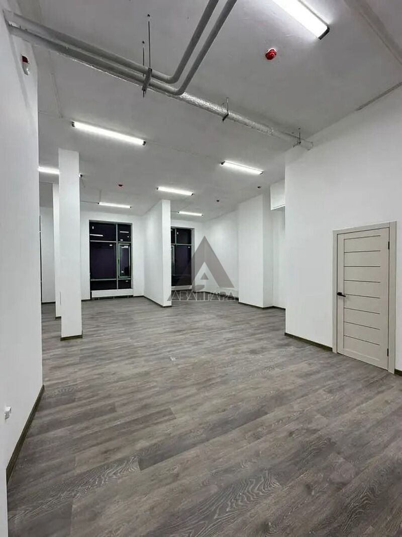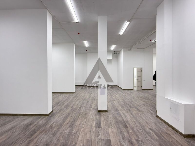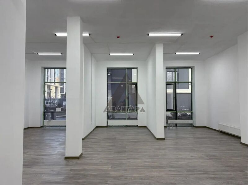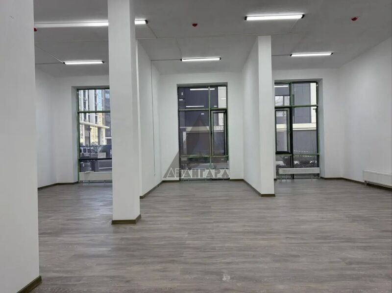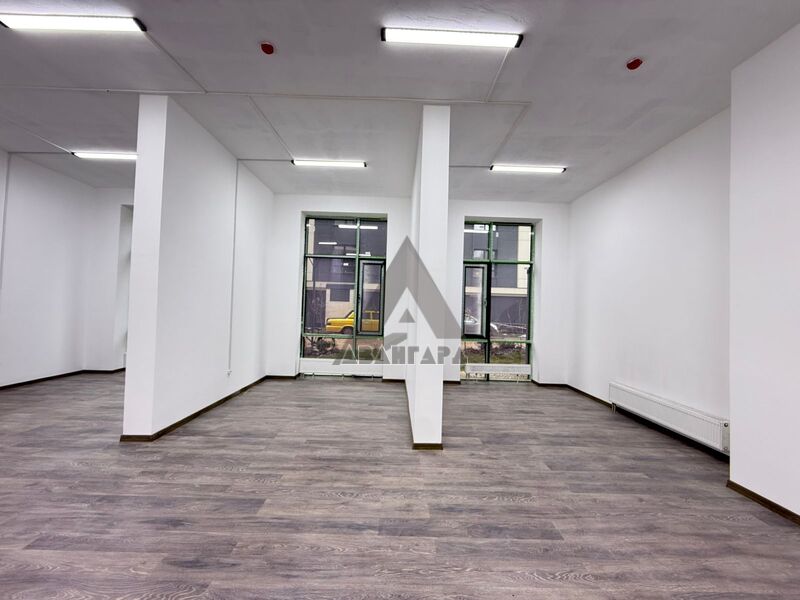Ровные стены, нейтральная отделка, 3 больших витражных окна-отличная освещенность и презентабельный фасад.