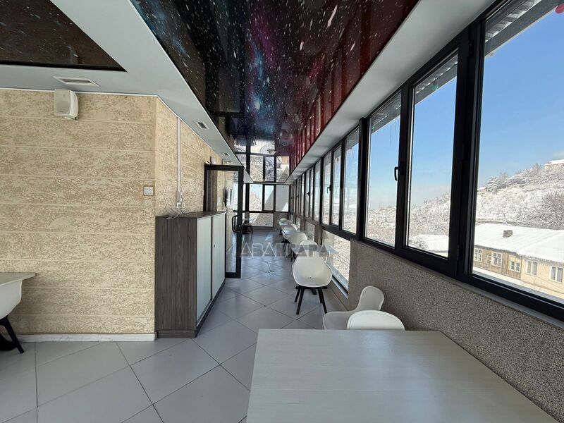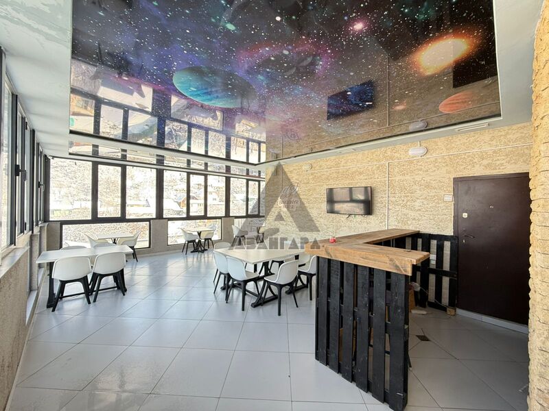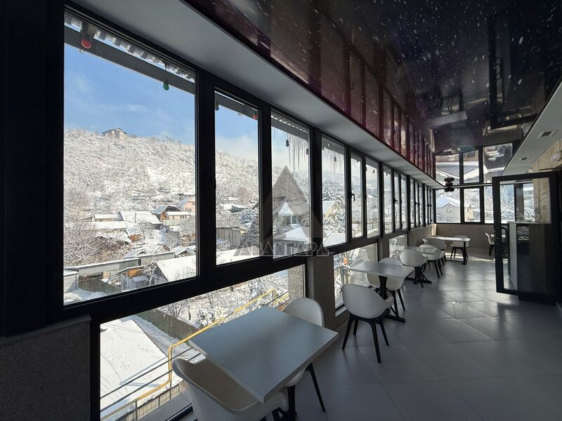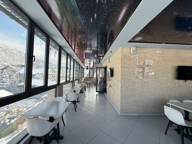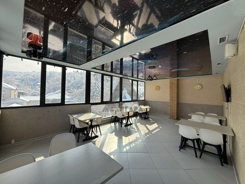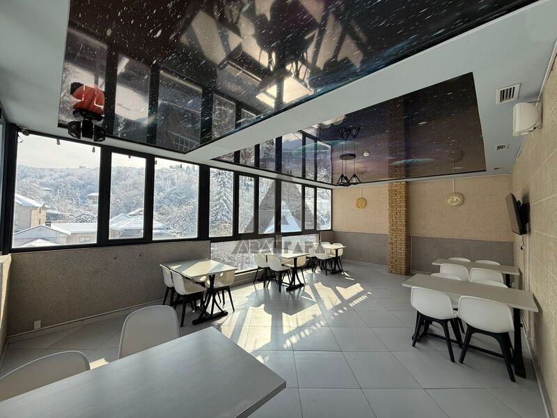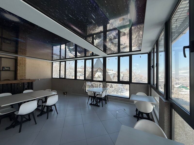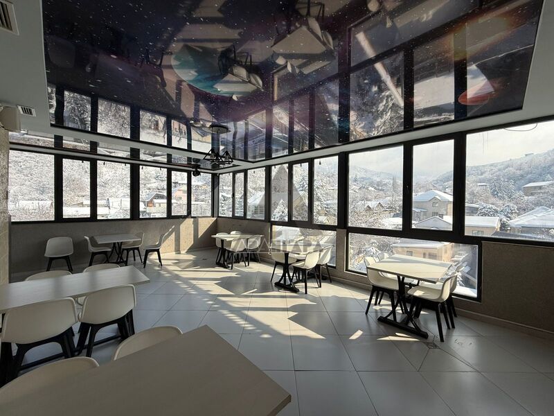 просторное помещение, которое можно использовать под ресторан, лаунж или приватный зал. Из окон открывается красивый панорамный вид на горы и город.